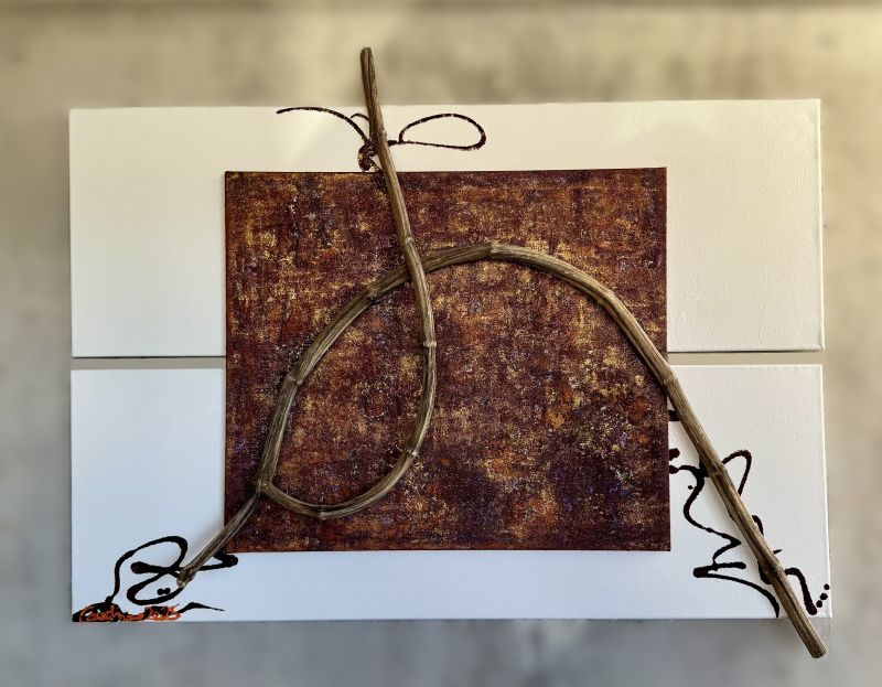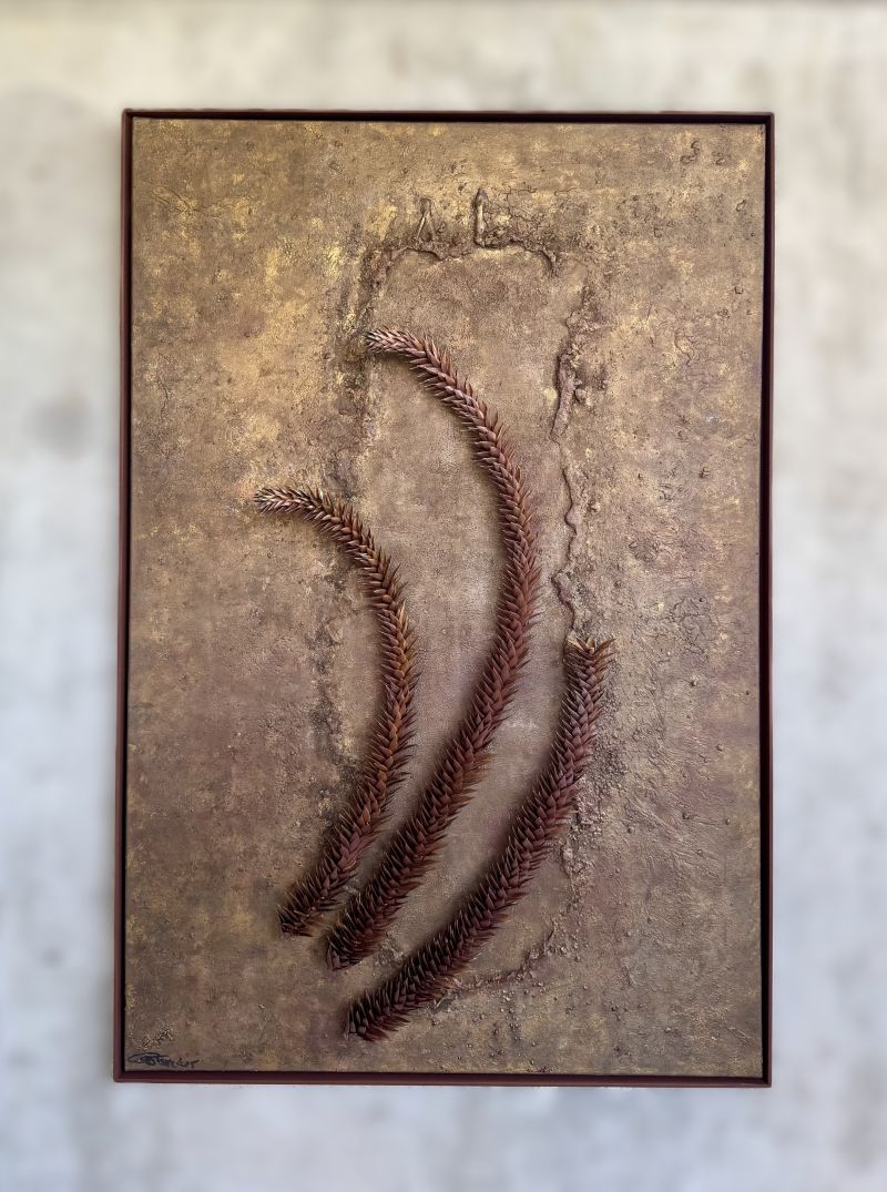 80 x 110 cm, gerahmt | 5-fache Streichtechnik, Acryl, Verputz, Sand, Steine, Schwemmholz, Lack, Stachelbaum. |