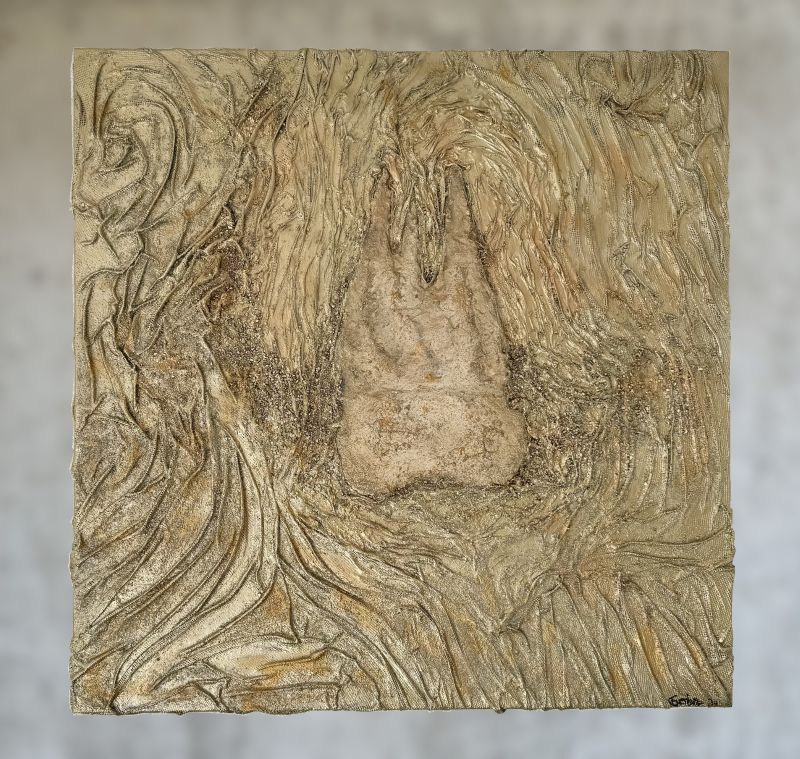 100 x 100 cm, gerahmt | Acryl, Lack, Gips, Lehm, Stoff, Steine, Blattgold, Goldfäden.
