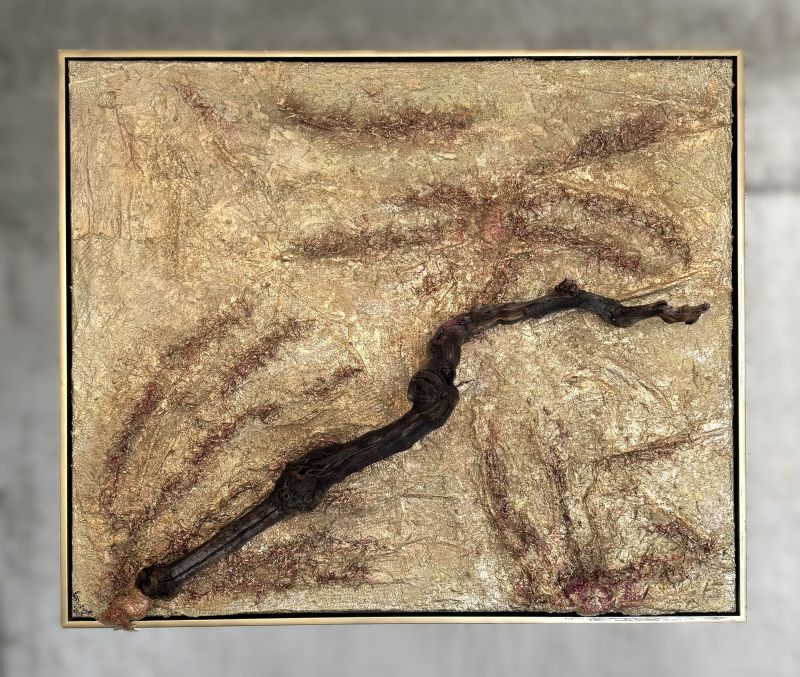 120 x 150 cm, gerahmt | Marmormehl, Verputz, Kleber, flüssiges Perlmuth, Sand-Spray, 4-fache Schabtechnik, Holzscheiben (Weinreben)